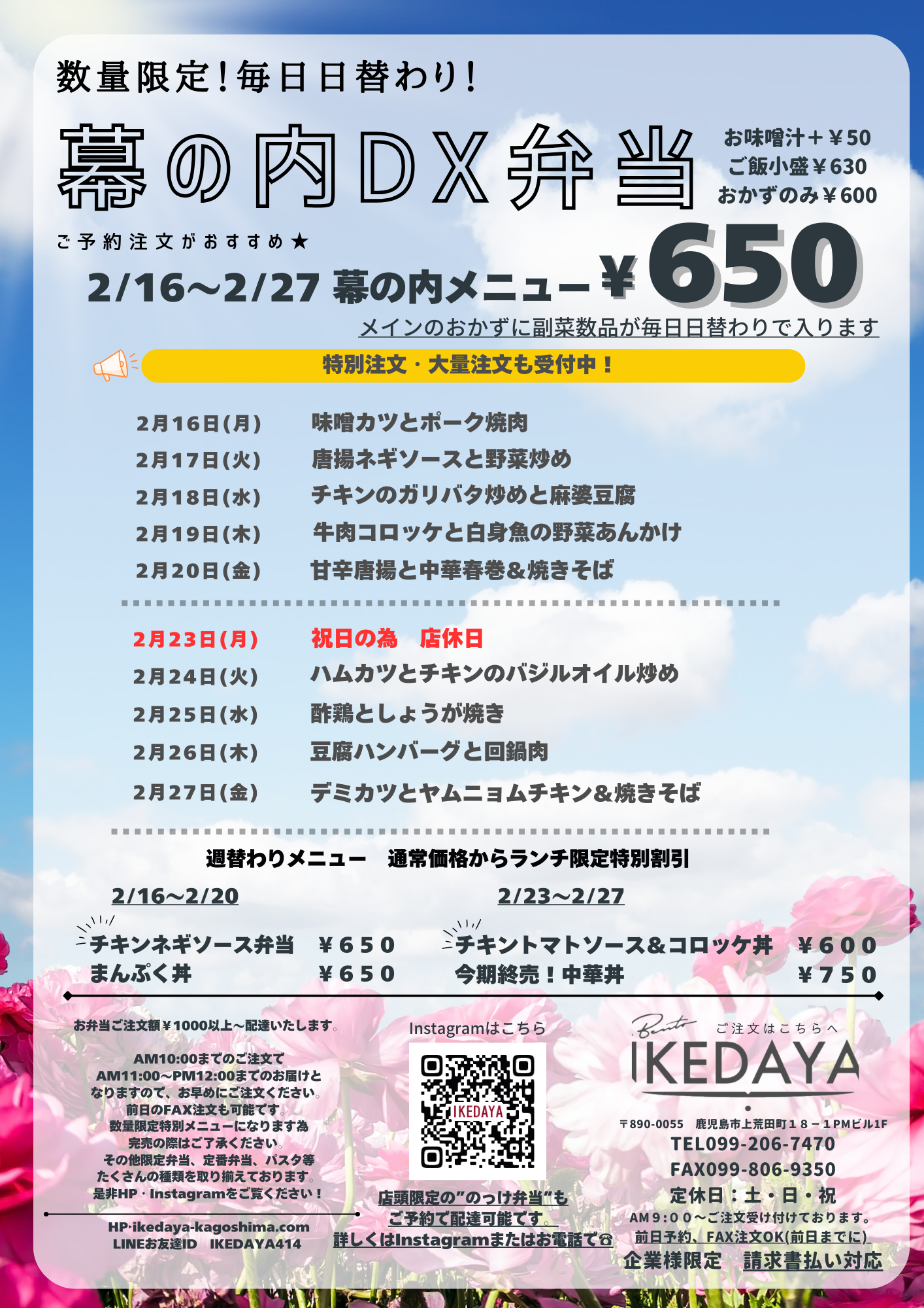 いけだ屋の想い 毎日の昼食、夕食に、「満腹」「満足」のお弁当を食べていただきたい!!安心安全なお弁当で満腹!!満足!!になれるよう、心を込めてお弁当をお作り致します。当店のこだわりや想いのこもったお弁当で“満腹”“満足”になってもらい、少しでも毎日の仕事や家事、学校などに頑張る皆様の力になれたら幸いです。 いけだ屋のこだわりを見る