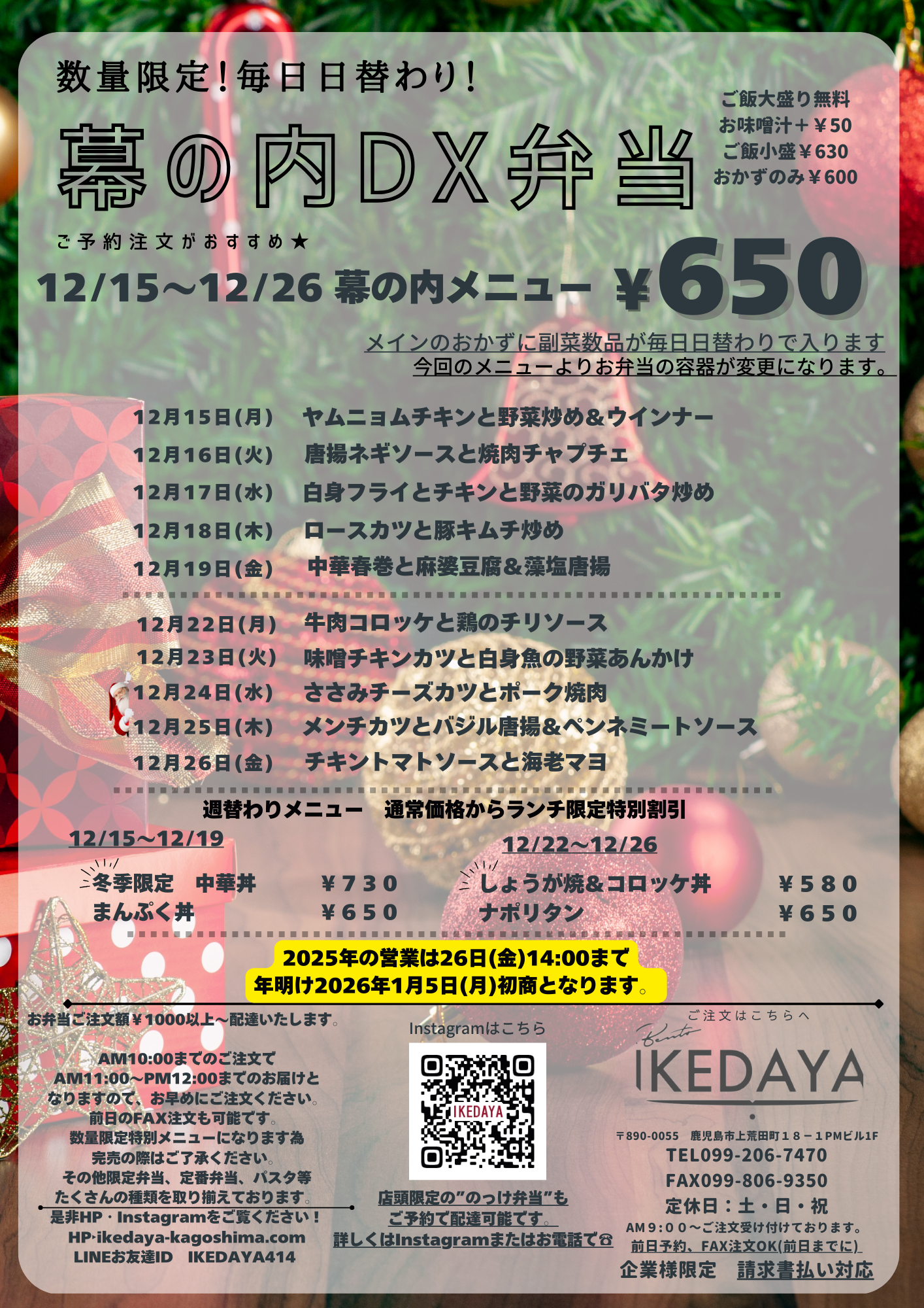 いけだ屋ブログ 2024.10.22 お知らせ 2025肉おせち 2023.10.06 お知らせ 2023年Xmasパーティーセットのご予約開始! 2023.10.06 お知らせ 2024!肉おせち予約開始!! 2022.11.28 お知らせ 肉おせち今年も完売!! 2022.10.12 お知らせ 2023肉おせち予約開始! ブログ一覧を見る